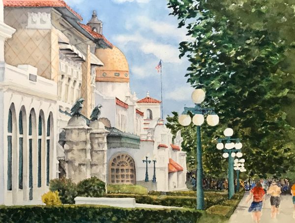 In this watercolor, I reflected the vibrant rhythm of our downtown and the enduring beauty of Historic Bathhouse Row in Hot Springs National Park. I painted the piece through layered transparent washes, allowing light to surface gradually, using controlled edges and selective detail to capture locals and visitors enjoying the walk, the architecture, and the pace of the morning.