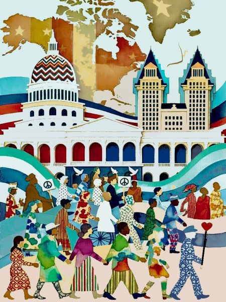 This work commemorates America’s 250 year weaving healing waters between a diverse community marching familiar monuments. Viewers are invited to reflect on walking, and the greenway as a tapestry of progress-each step forward, rooted in peace and unity, shaping the enduring shared landscape of democracy.