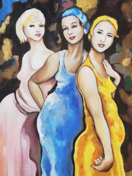 A Living Mosaic depicts three women standing together as distinct yet interconnected presences. Through color, gesture, and quiet unity, the painting reflects community and shared humanity across the Americas, inviting viewers to recognize everyday connection as a living cultural bond across the hemisphere.