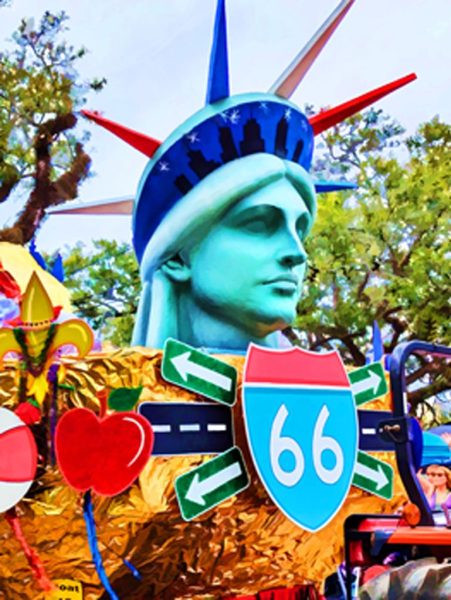 Liberty is a photograph of the front of a Mardi Gras float in the Krewe of Mid-City in 2024. The parade theme, Cheers to 90 Years, lent itself to this ode to America with the re-creation of several iconic images. By saturating the colors, the statue really pops out!